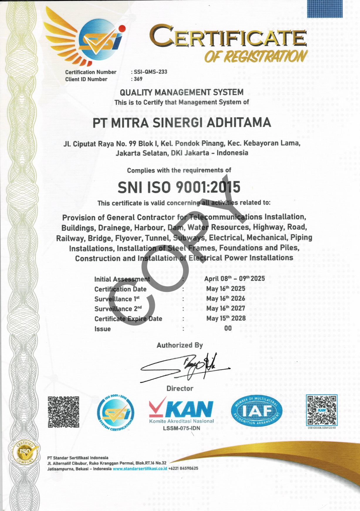 MSA adalah perusahaan yang mengutamakan kualitas dan profesionalisme dalam melayani kebutuhan klien Kami berusaha untuk memenuhi kebutuhan pelanggan di seluruh Indonesia dengan memaksimalkan nilai tambah dari layanan kami Pada saat yang sama, kami lebih menekankan keselamatan dan kualitas sebagai dasar untuk manajemen dimana kami memanfaatkan keahlian kami yang luas dan teknologi canggih yang terakumulasi selama bertahun tahun untuk memberikan layanan berharga kepada pelanggan kami.